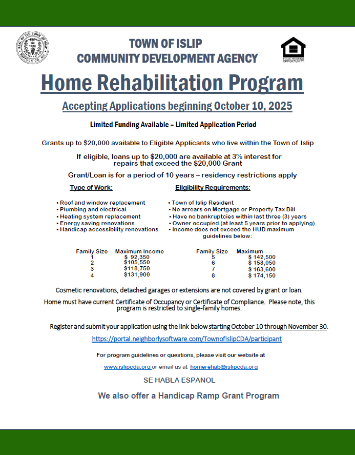The Town of Islip CDA has completed the Town’s 2024-2025 Consolidated Annual Performance and Evaluation Report (CAPER).